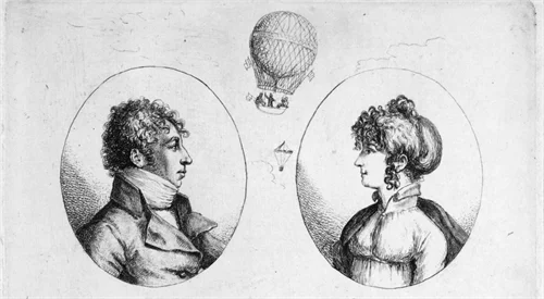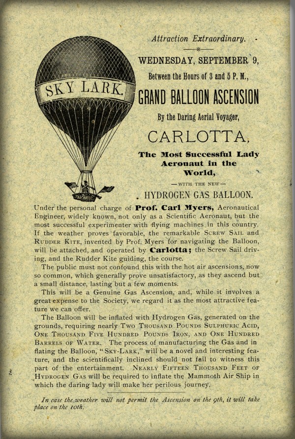 Jenny Rumary Van Tassel was no soft, timid, shrinking wife of balloonist “Professor” Park Van Tassel. Described as big, young, handsome and blonde; on the 4th of July 1888, Jenny, escaped from the detective who had been sent to stop her, climbed into husband’s balloon gondola, rose to 6,000′ above Los Angeles and then, without hesitation, launched herself and her 28′ parachute into the air.“It is only a question of nerve,” said Mrs. Van Tassell, when asked about her exploit. “I made up my mind that I could jump from a balloon and when I make up my mind to do a thing I do it. So, when we were over a clear place, they opened the valve to hold the balloon stationary and give the ‘chute a start to open a little, and then I said good-by and jumped.