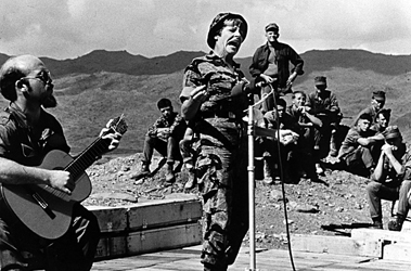 She originally went to Vietnam to entertain the troops and after being caught in a firefight with Viet Cong regulars at the Special Forces 25th Division Infantry camp, “The Big Mouth”, wearing tiger-striped fatigues, green beret and Oak leaf clusters, pulled rank and joined in treating “her troops” before being evacuated with the rest of the entertainers to Tay Ninh. On another occasion, during a days’ long battle near Soc Trang, Colonel Maggie would cover the surgical shift working all day long and finishing the nights with her shows.